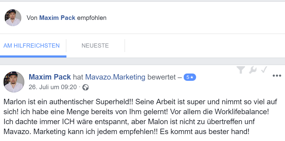 "Ich kenne Marlon schon seit 6 Jahren. Damals sind wir zusammen bei 0 im Vertrieb gestartet. Schon damals hat Marlon sich sehr intensiv mit dem Thema Onlinemarketing befasst. Seine Expertise kommt nicht von ungefähr, da er auch schon von Anfang an einen Großteil seines Geldes in Weiterbildungen investiert hat. Wer sich erfolgreich digitalisieren will, kommt nicht um Mavazo.Marketing vorbei."